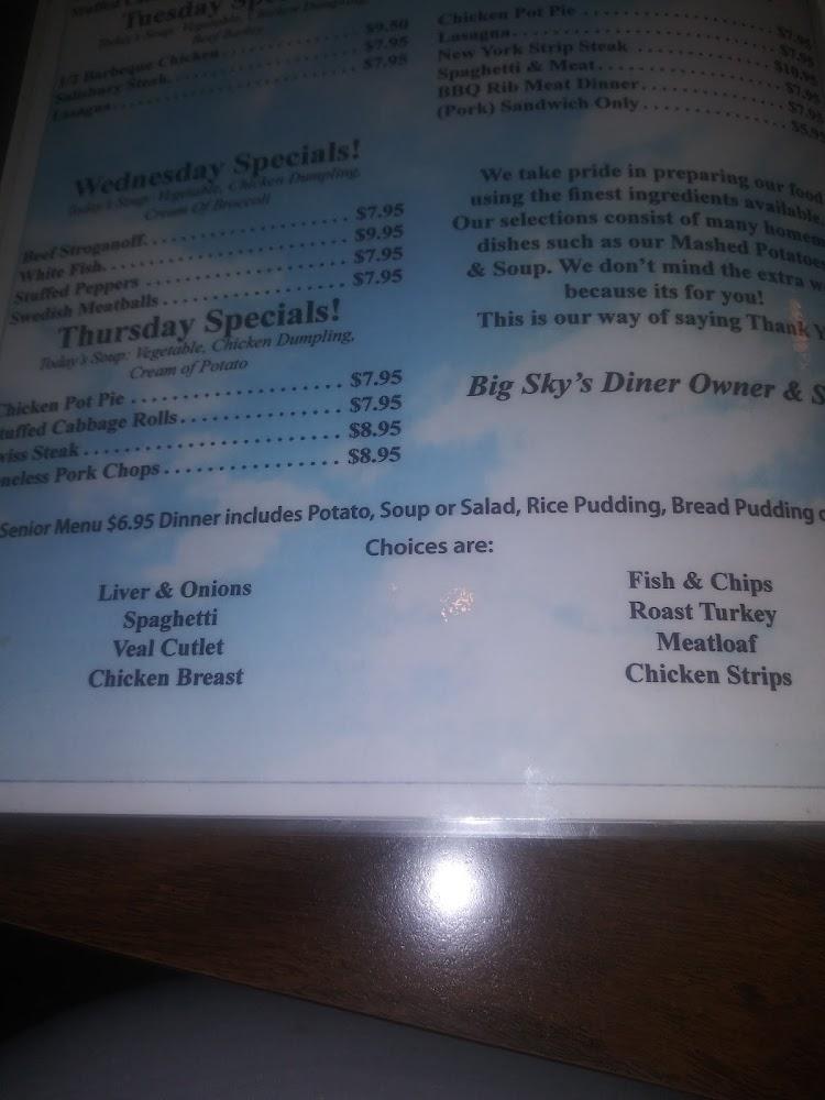 Big Sky Diner features an extensive menu catering to diverse tastes. The breakfast selection includes skillets, omelettes, and traditional sides such as hash browns. Diners can opt for hearty sandwiches and classic burgers during lunch or dinner. Signature items include the Big Sky Special, a delightful plate everyone loves. The menu highlights local favorites while offering traditional diner fare. Lunch and dinner options also feature satisfying salads and comforting soups, with affordable prices. Desserts provide a sweet ending to any meal, making it a complete dining destination.
